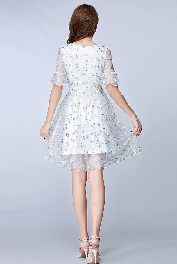 「破格」 ワンピース メッシュレース 刺繍 Vネック ボタニカル 女子会