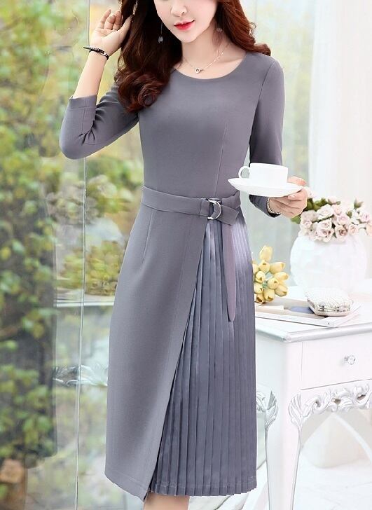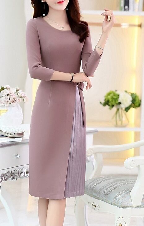 「破格」 ワンピース ラウンドネック スリット プリーツ タイト 通勤