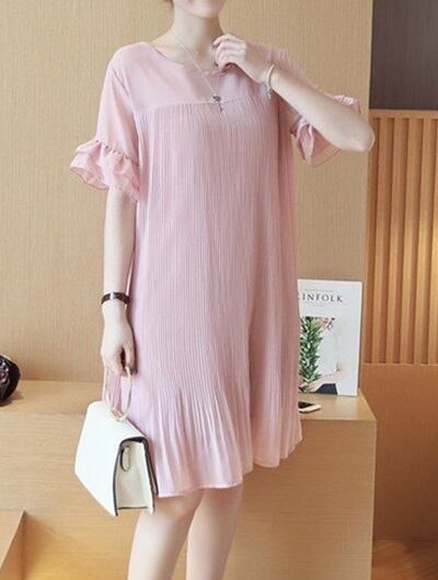 「破格」 ワンピース ラウンドネック フリル プリーツ マタニティドレス