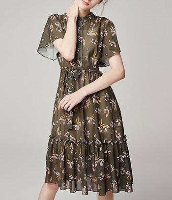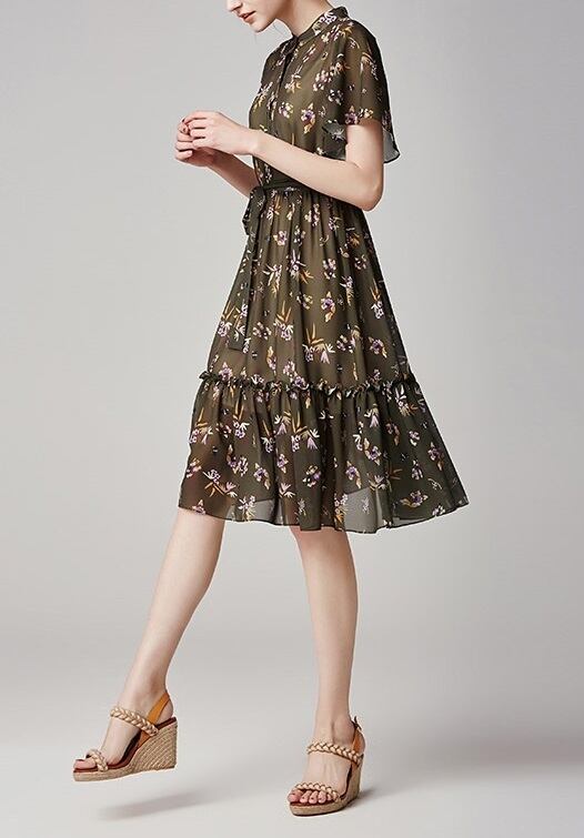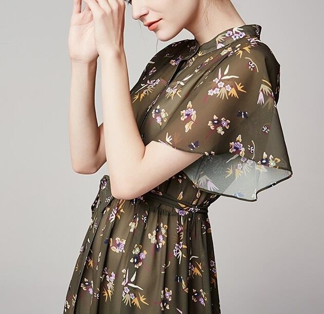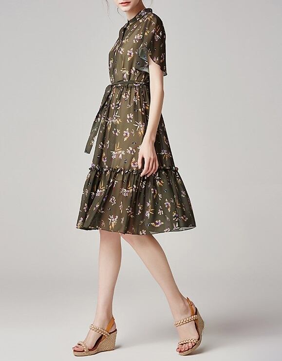 「破格」 ワンピース シフォン フレアスリーブ フラウンス レトロ 花柄