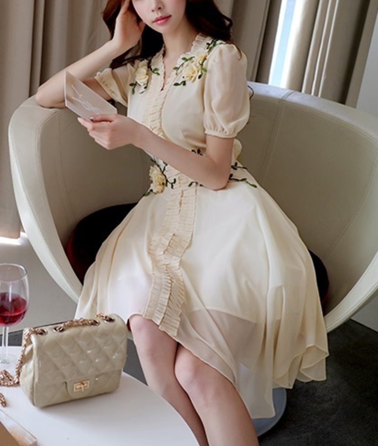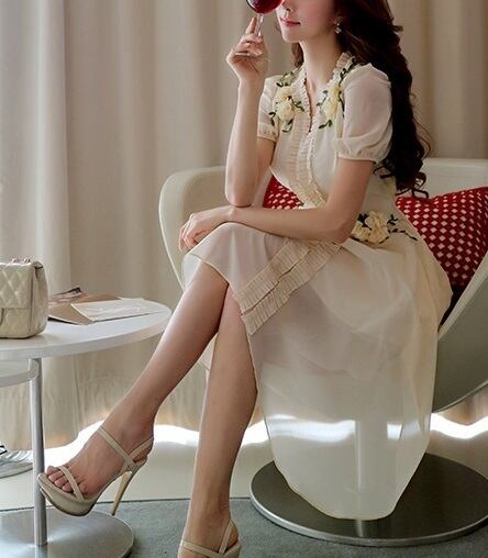 「破格」 ワンピース Vネック パフスリーブ フラワー フリル キュート