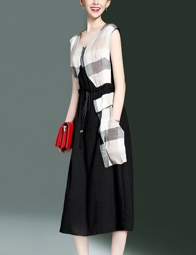 「破格」 ワンピース リネン ノースリーブ チェック柄 カジュアル 通勤
