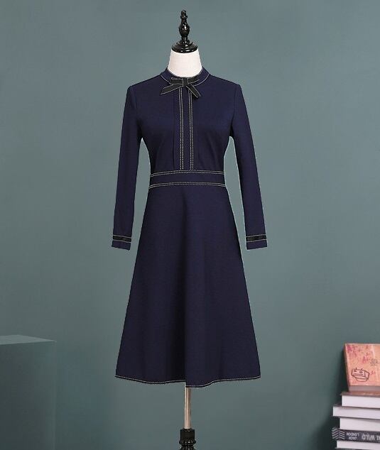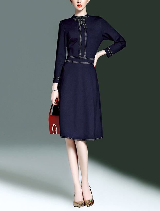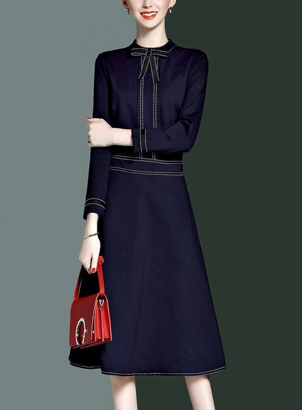「破格」 ワンピース ラウンドネック ステッチ リボン スリム フェミニン