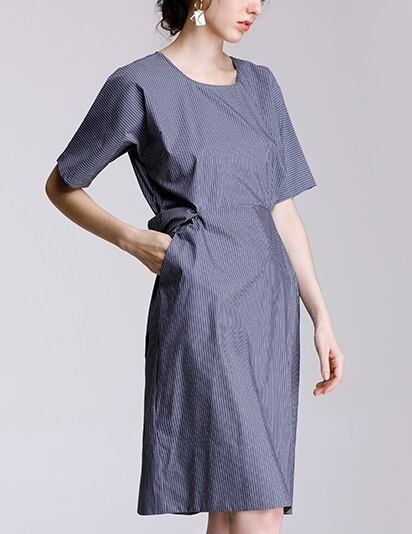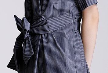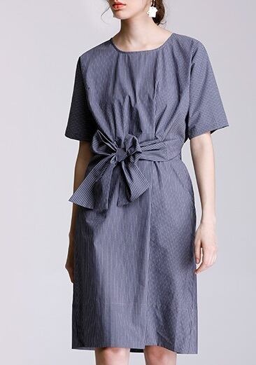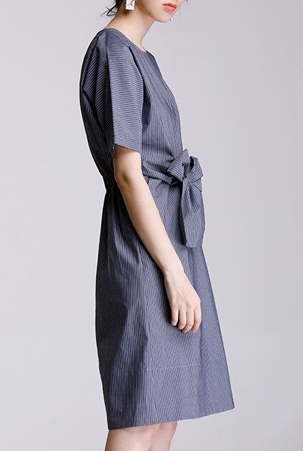 「破格」 ワンピース コットン ラウンドネック リボン ピンストライプ