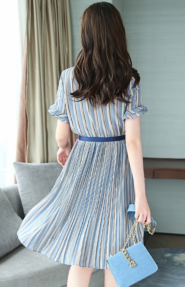 「破格」 ワンピース シフォン ラウンドネック 半袖 ストライプ プリーツ