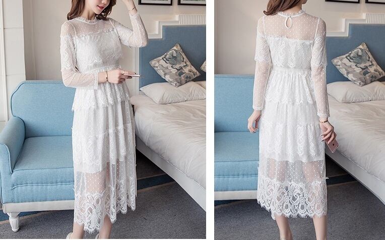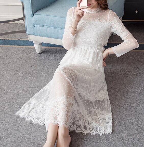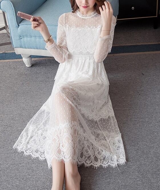 「破格」 ワンピース レース ラウンドネック 長袖 ミモレ丈 食事会 二次会