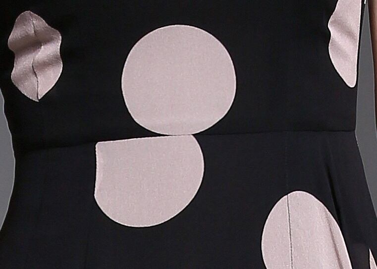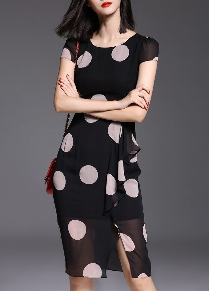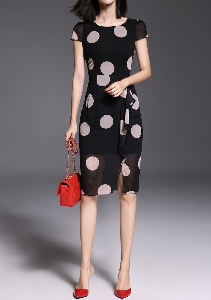 「破格」 ワンピース シルク ラウンドネック 半袖 ドット柄 ブラック 通勤