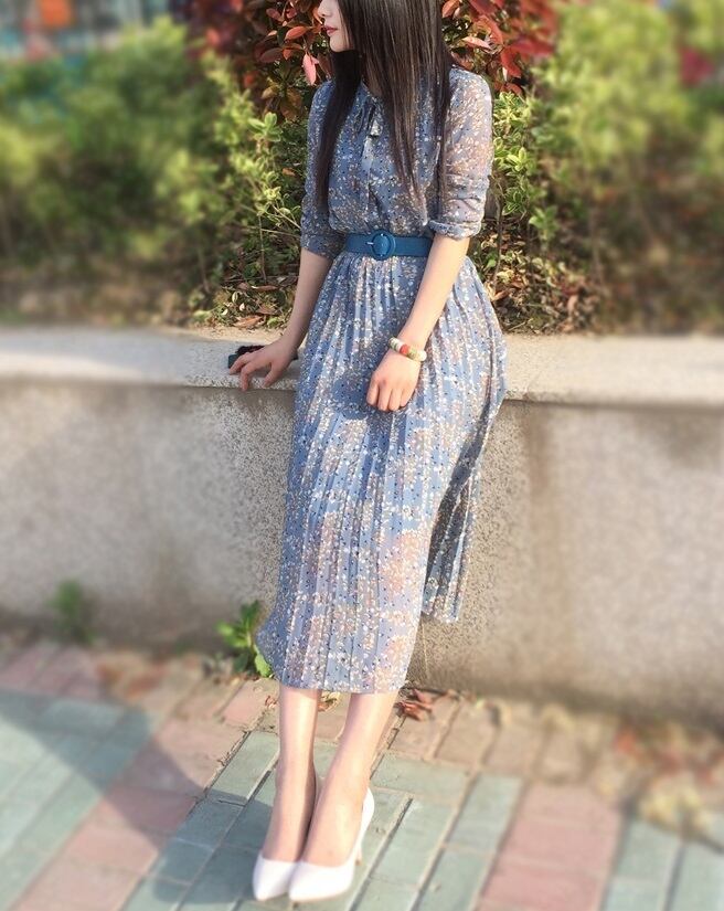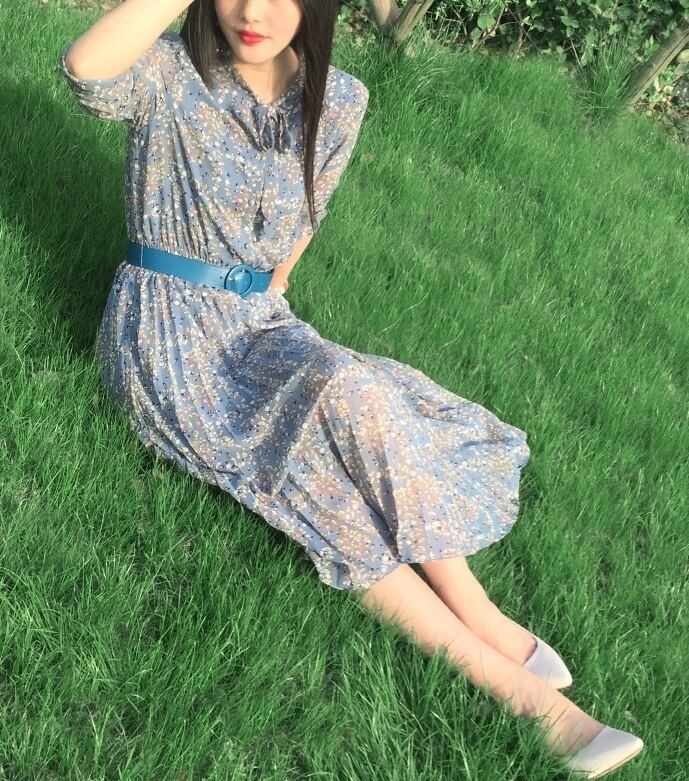 「破格」 ワンピース シフォン Vネック 五分袖 花柄 プリーツ ミモレ丈