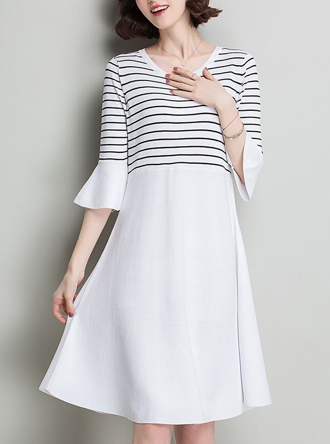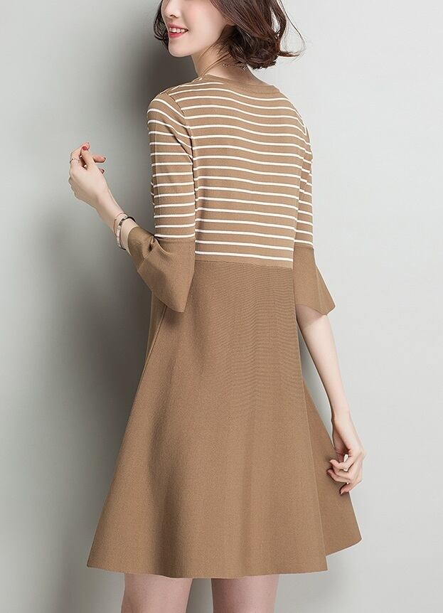 「破格」 ワンピース ニット ラウンドネック 五分袖 ボーダー柄 膝上丈