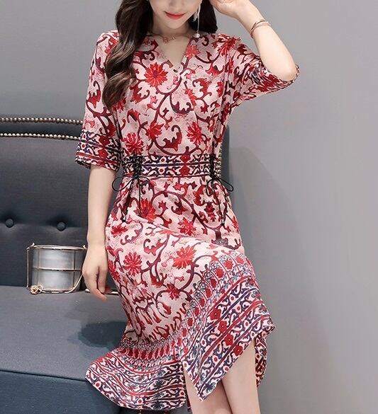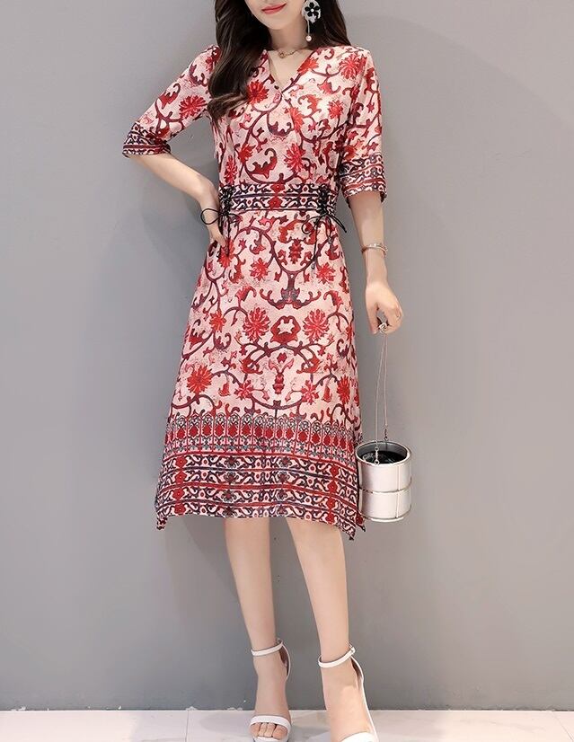 「破格」 ドレス ワンピ Vネック 五分袖 オリエンタル 食事会 女子会 赤