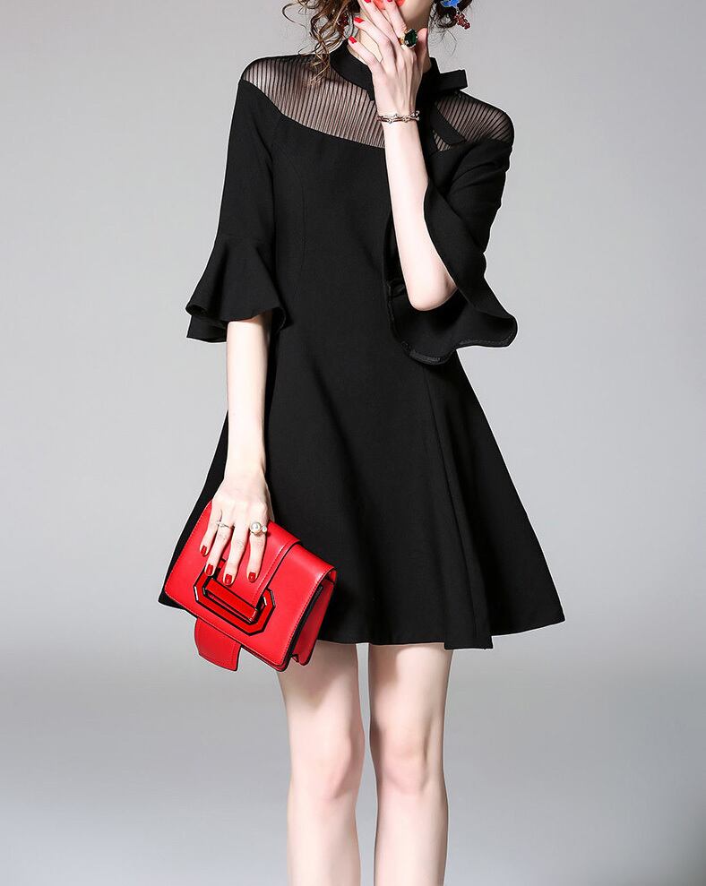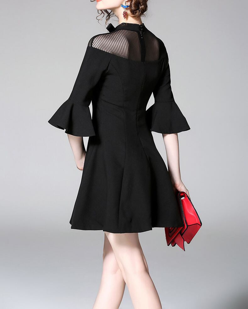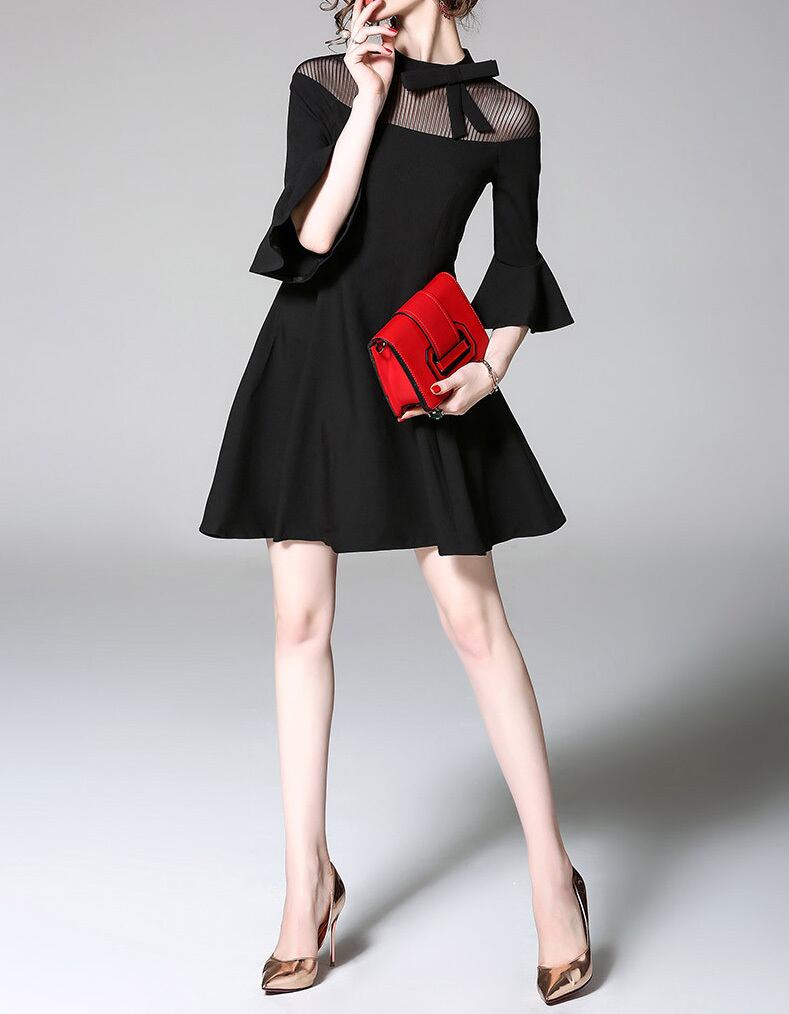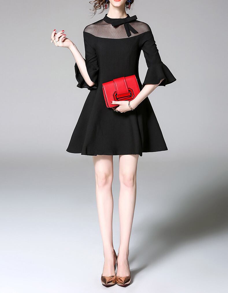 「破格」 ワンピース ドレス 七分袖 ミニ丈 結婚式 二次会 フレア リボン