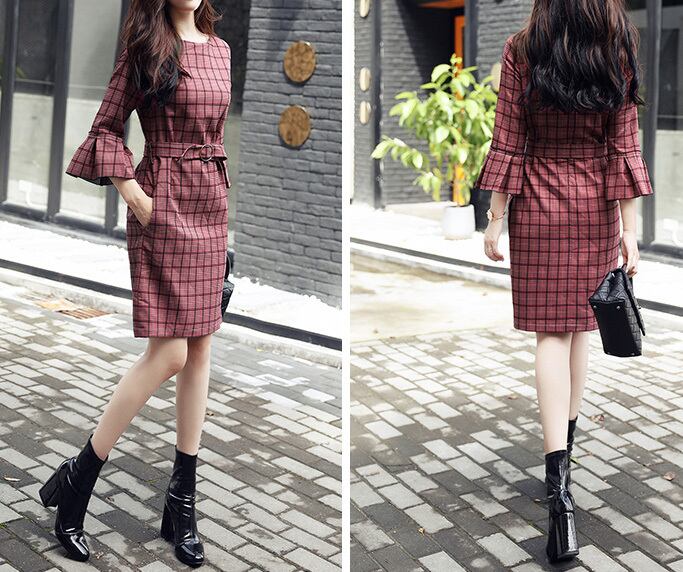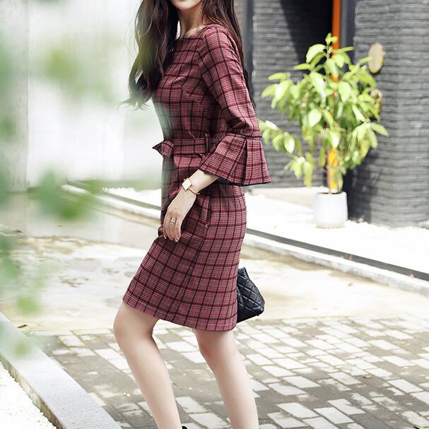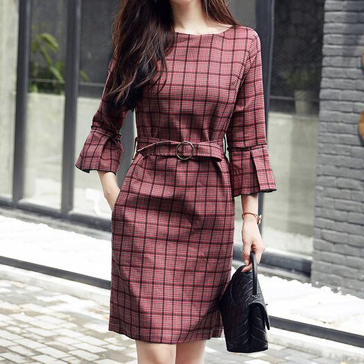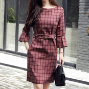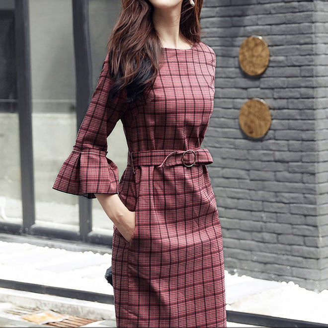 「破格」 ワンピース ドレス チェック柄 ひざ丈 七分袖 ベルト 2色