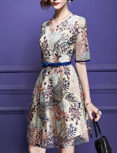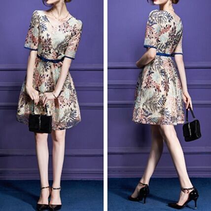 「破格」 ワンピース Vネック 半袖 細見え チュール パーティー Aライン