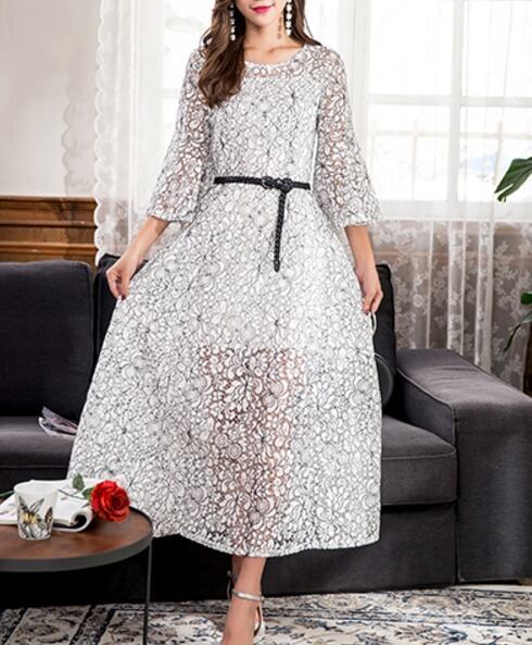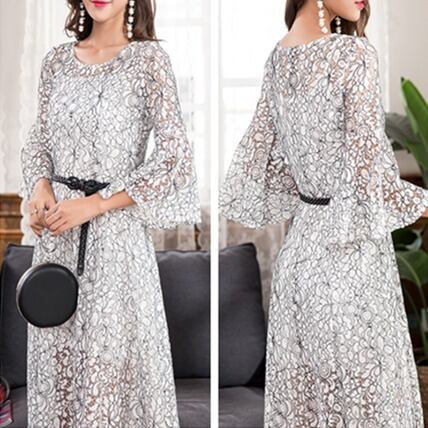 「破格」 ワンピース ロング フレア袖 透し彫り ベルト パーティー 宴会