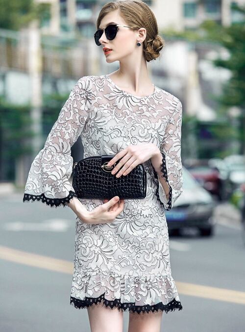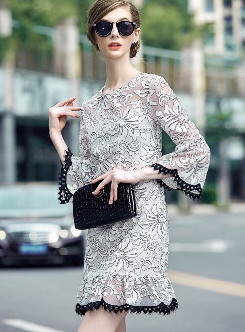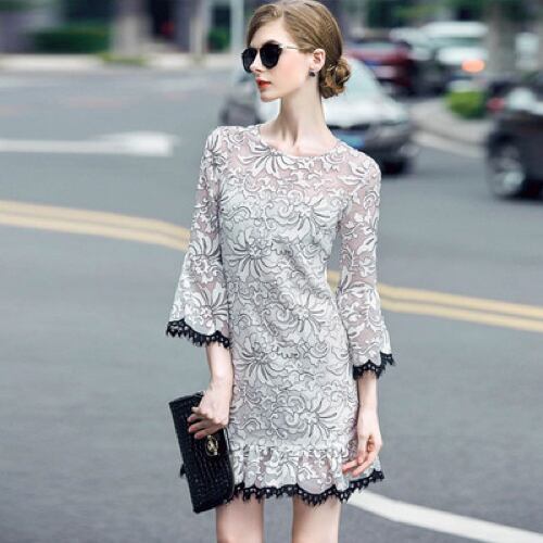 「大特価」 人気商品♪刺繍 フレア 7分袖 ドレスp2337