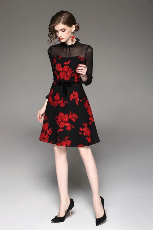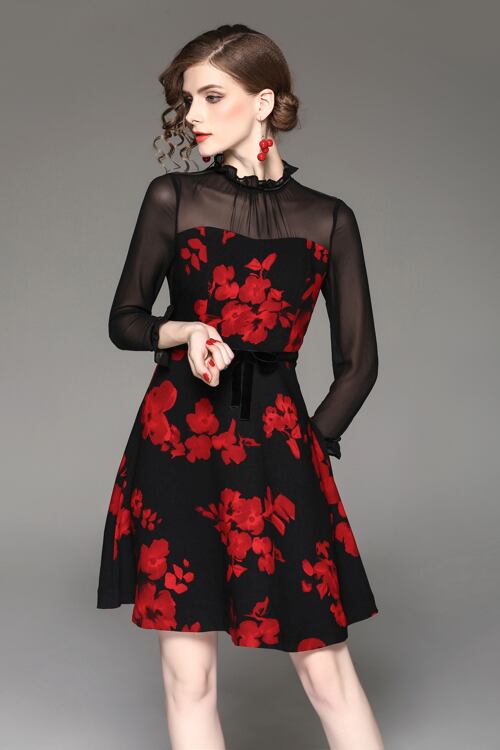 「大特価」 上品 長袖 切替 プリント 結婚式 お呼ばれ ドレス