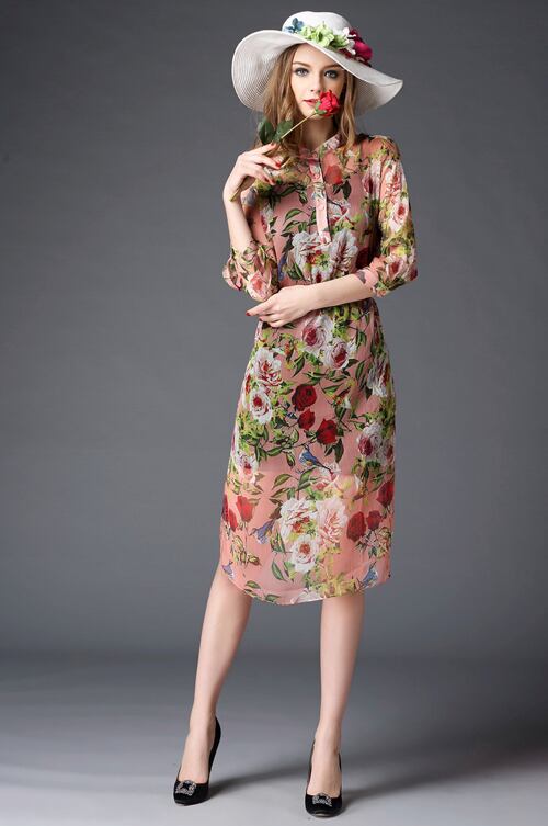 「大特価」 SS新作♪上質 フラワープリント 7分袖 2色 ワンピースp1917