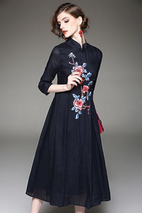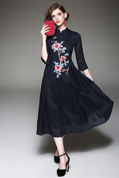 「大特価」 新作♪エレガンス 刺繍 スリム 7分袖 2色ワンピースp2703
