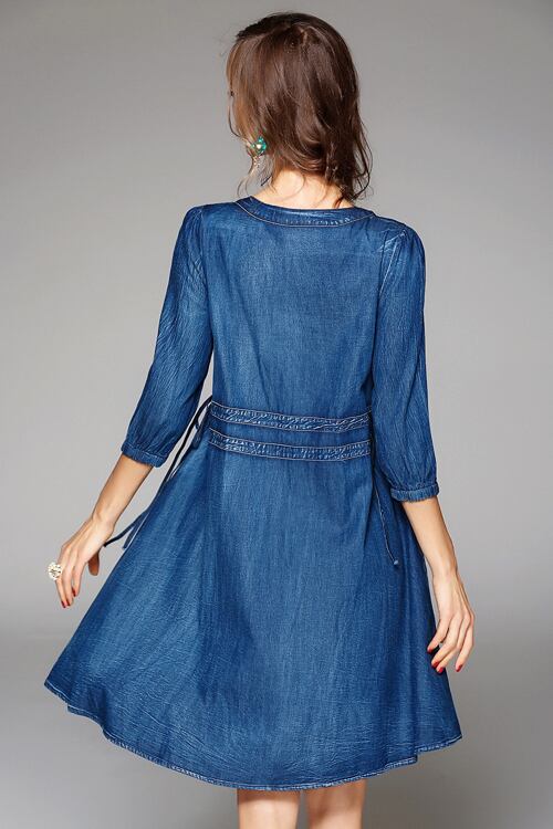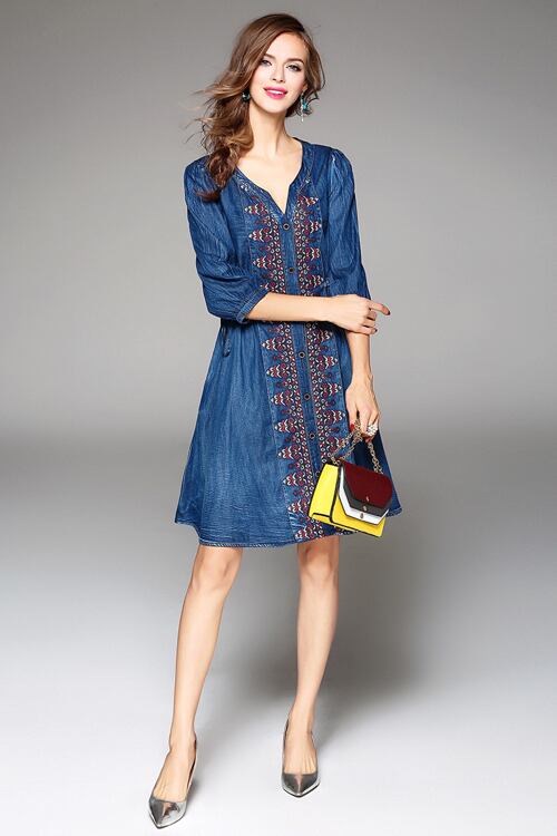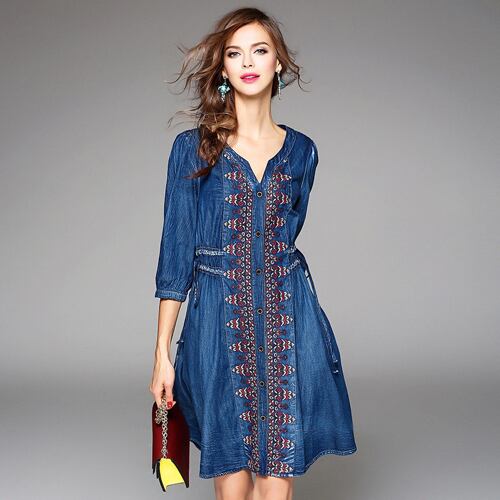 「大特価」 キュート デニム 刺繍 7分袖 ワンピース ドレスp2991