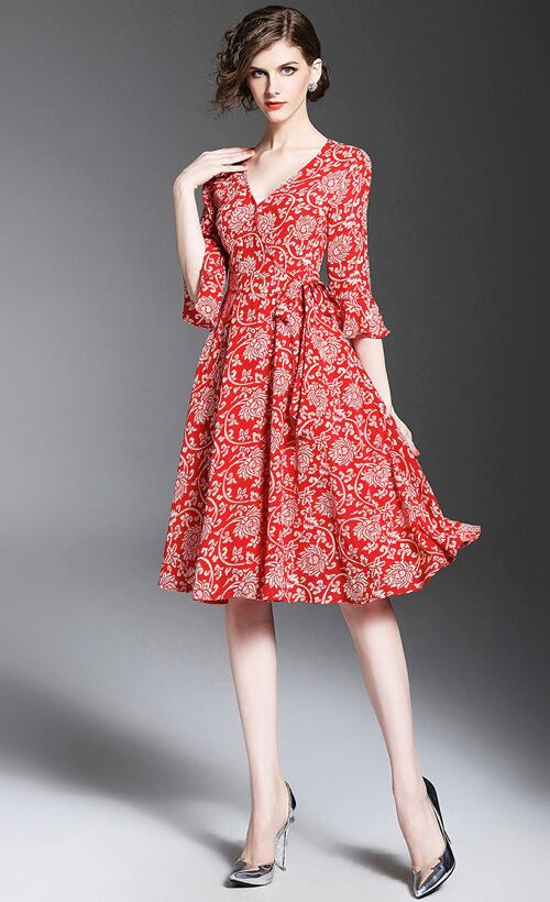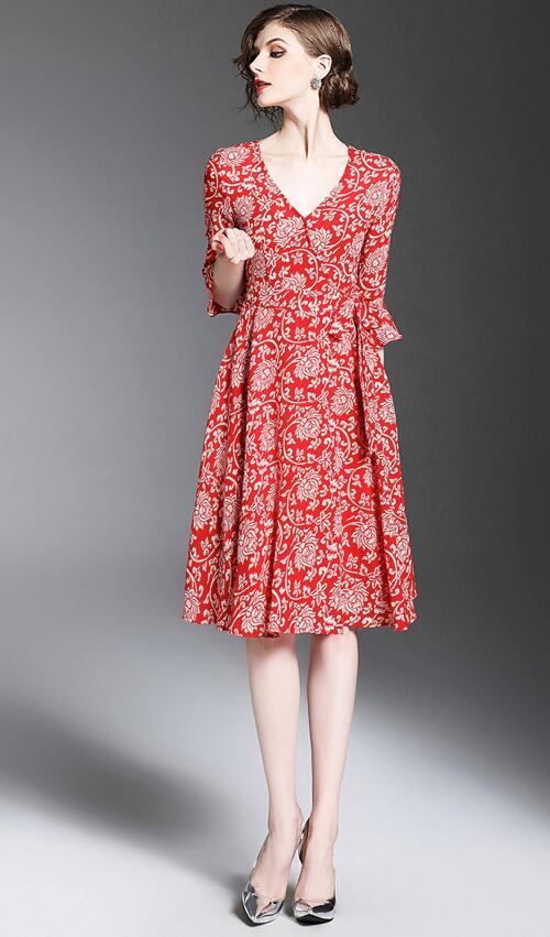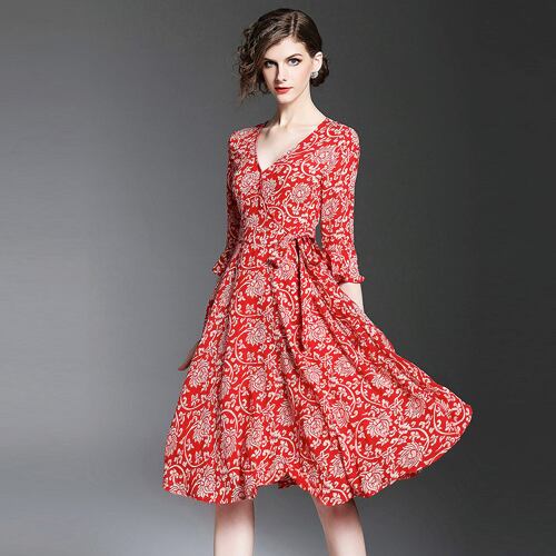 「大特価」 新作 プリント スリム リボン ワンピース ドレスp3081