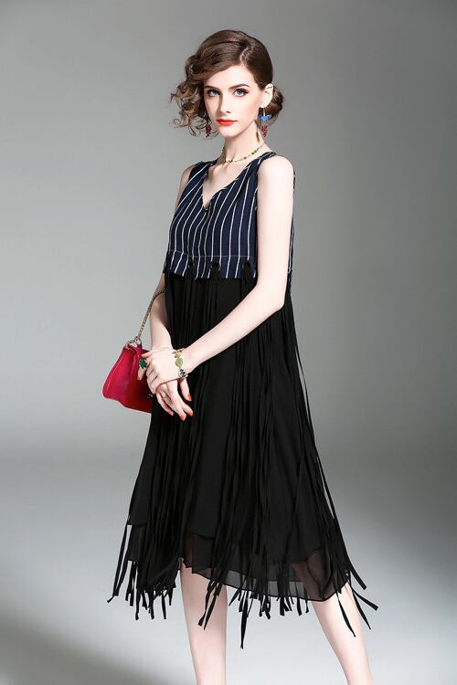 「大特価」 ノースリーブ 切替 タッセル ワンピース ドレスp3204
