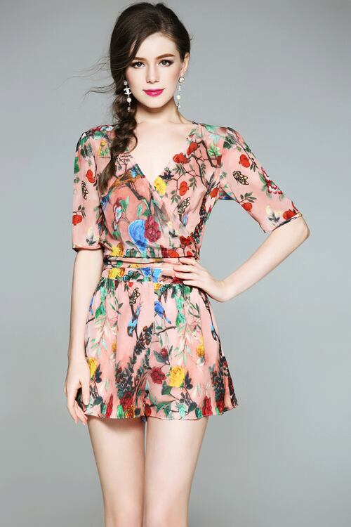 「大特価」 キュート プリント Vネック オールインワン T6971
