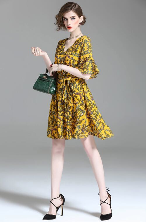 「大特価」 キュート 半袖 フリル 小花 プリント Vネック ワンピース