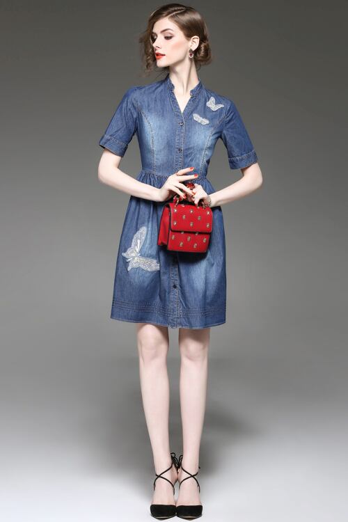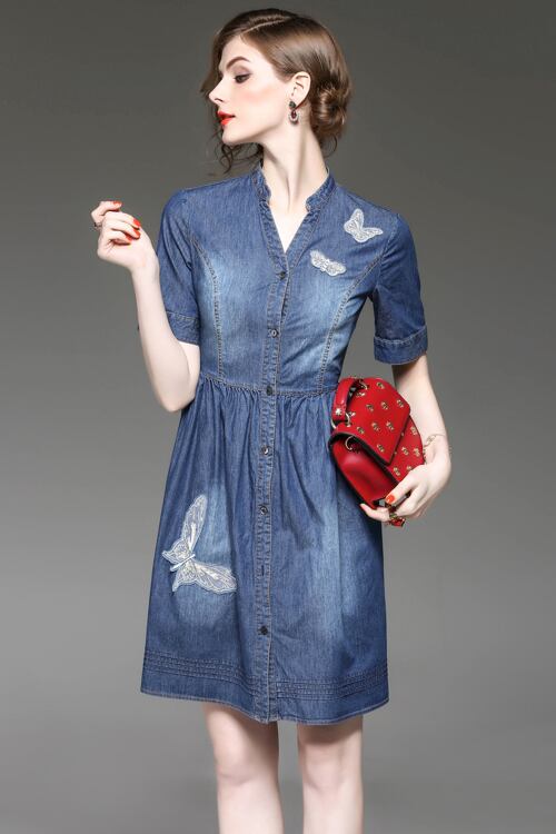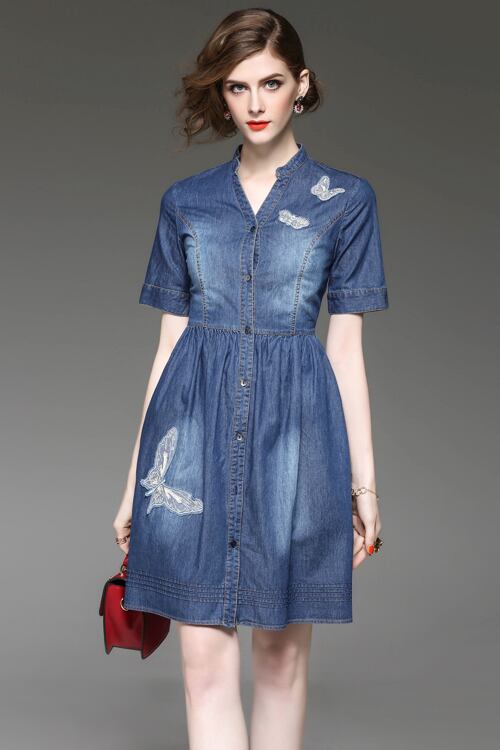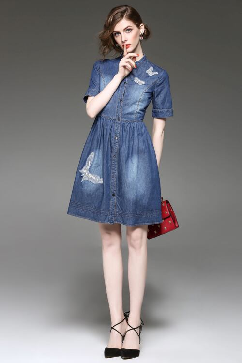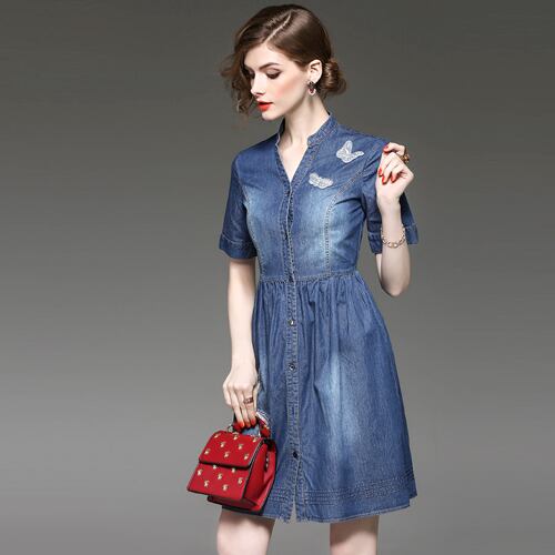 「大特価」 キュート デニム スリム 半袖 ワンピース