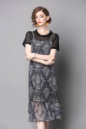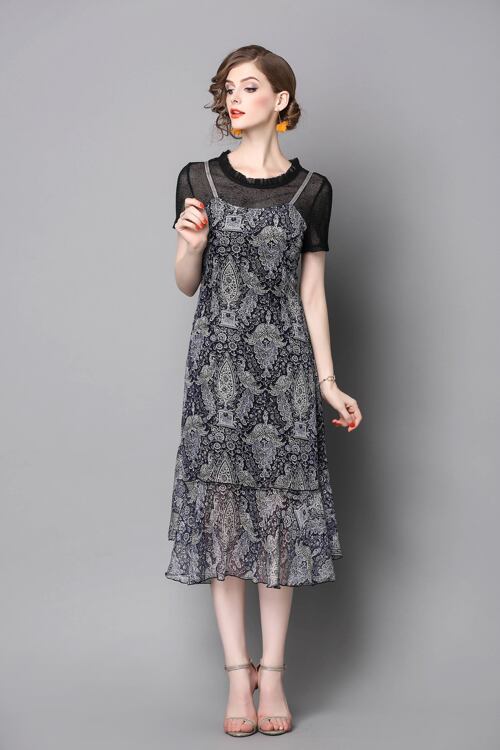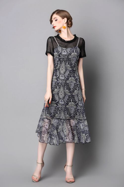 「大特価」 新作 プリント フレア 半袖 スリム ミディ丈 ワンピース