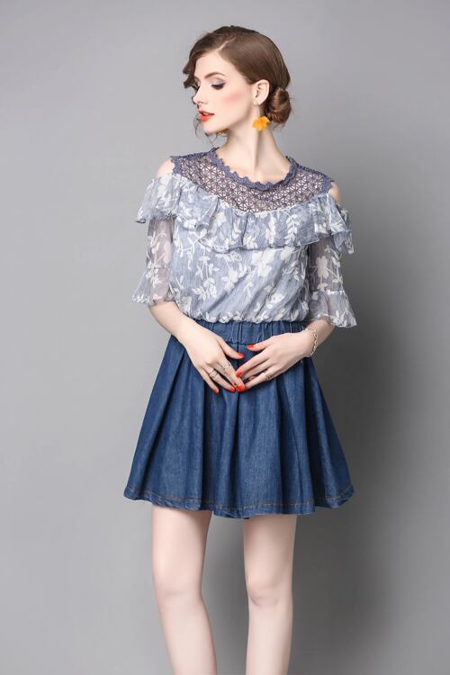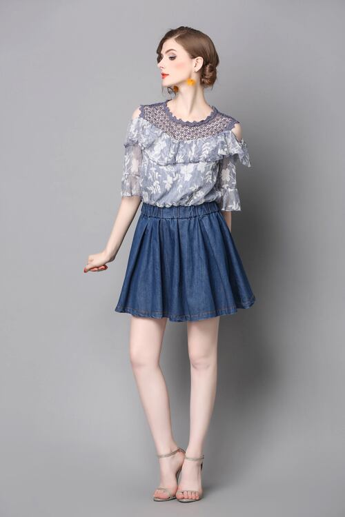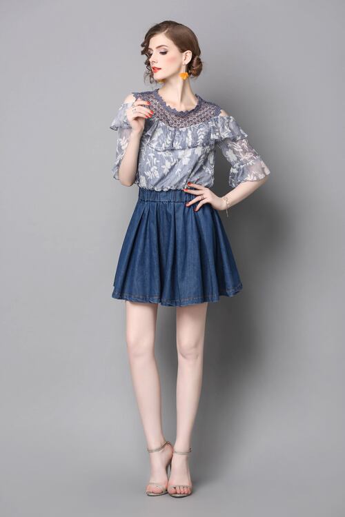 「大特価」 新作 デニム フリル シフォン 切替 ワンピース
