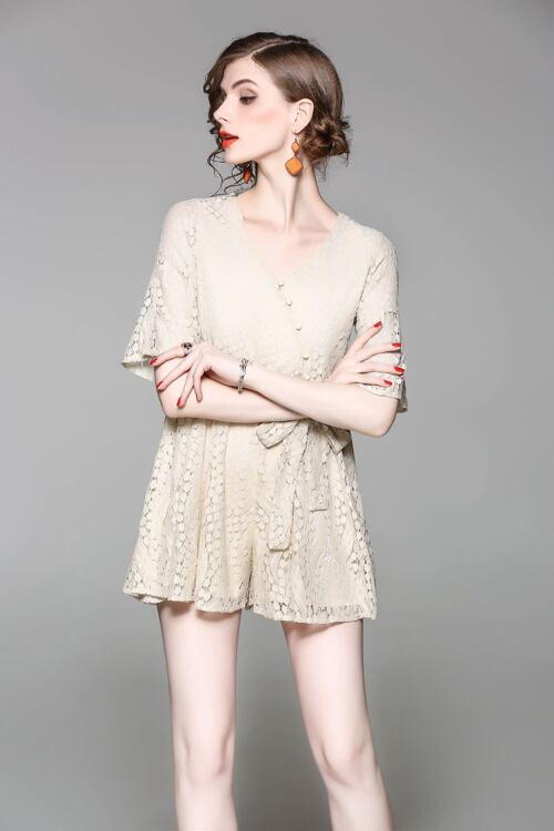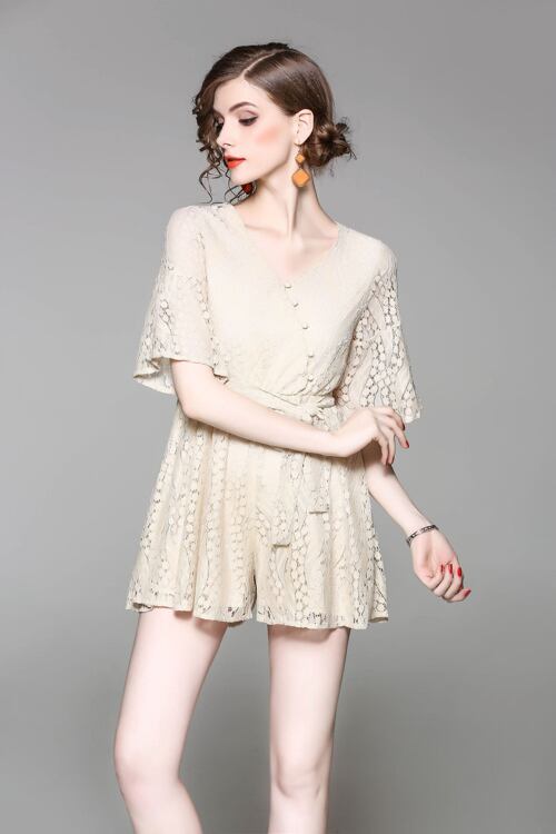 「大特価」 新作 レース Vネック 半袖 オールインワン