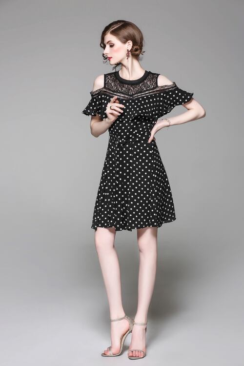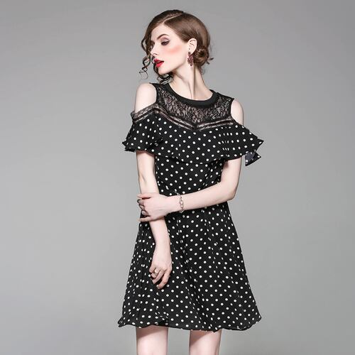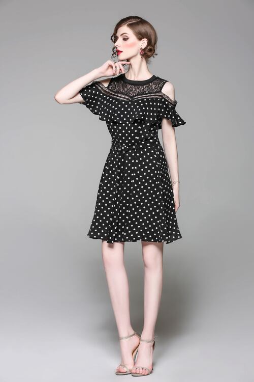 「大特価」 新作♪キュート ドット柄 レース 切替 フリル ワンピース