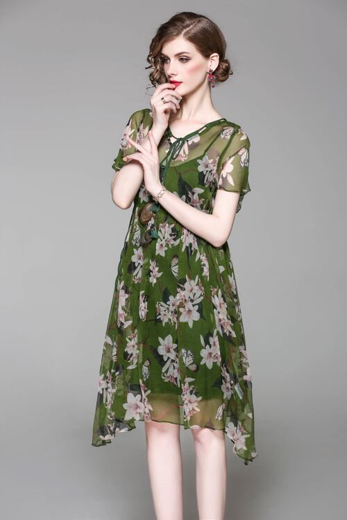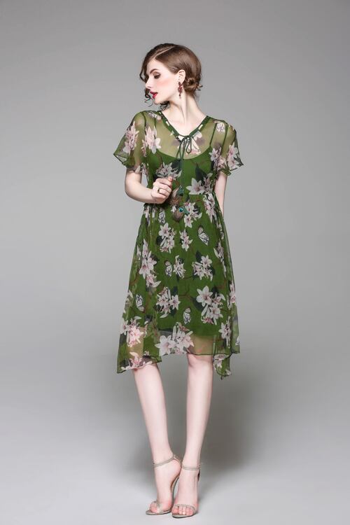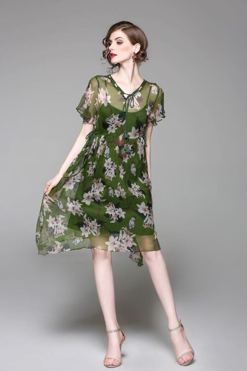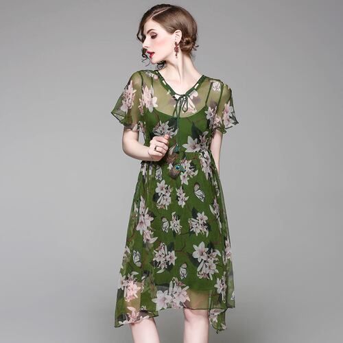 「大特価」 新作 シースール フラワー プリント リボン ワンピース