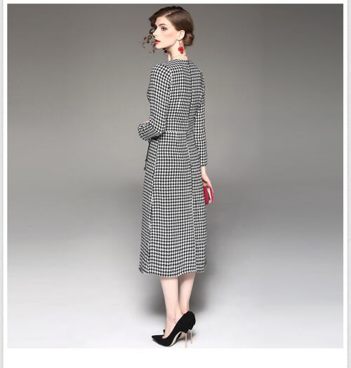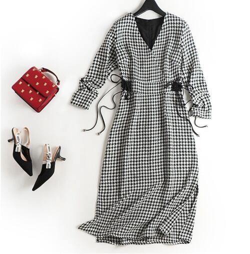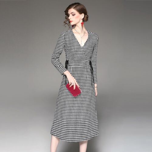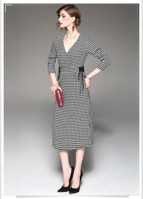 「大特価」 新作 Vネック 千鳥 スリム ミディ丈 ワンピース