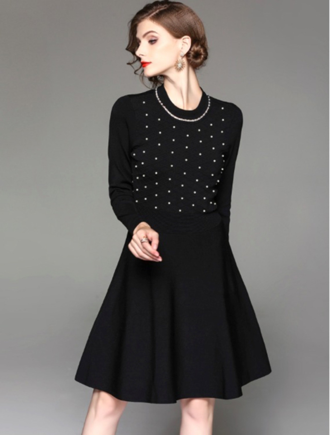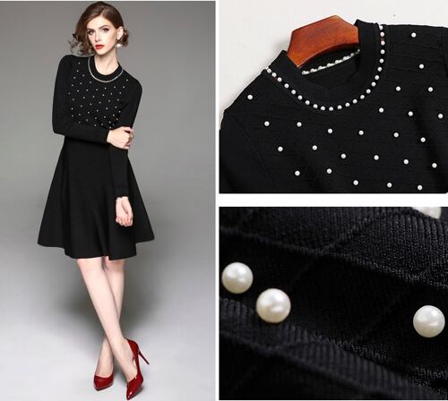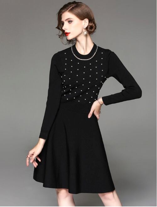 「大特価」 新作 上品 ニット スリム パール風 長袖 ワンピース