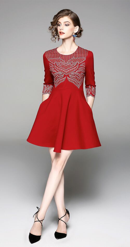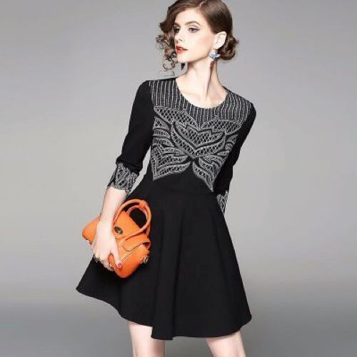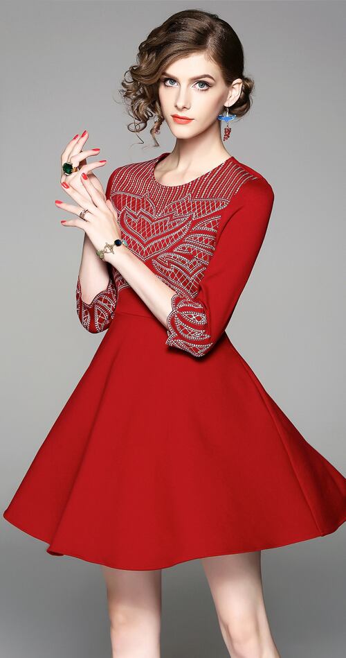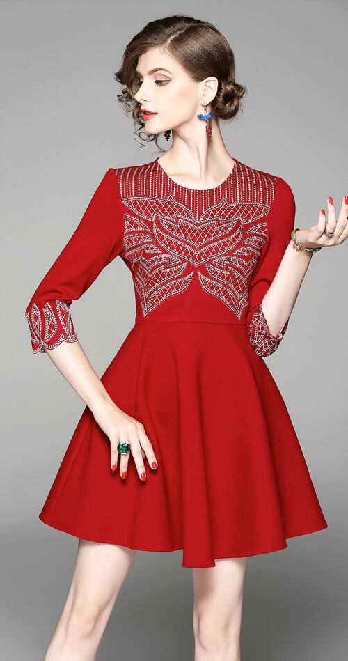 「大特価」 新作 上品 刺繍 スリム 7分袖 2色 結婚式 ワンピース