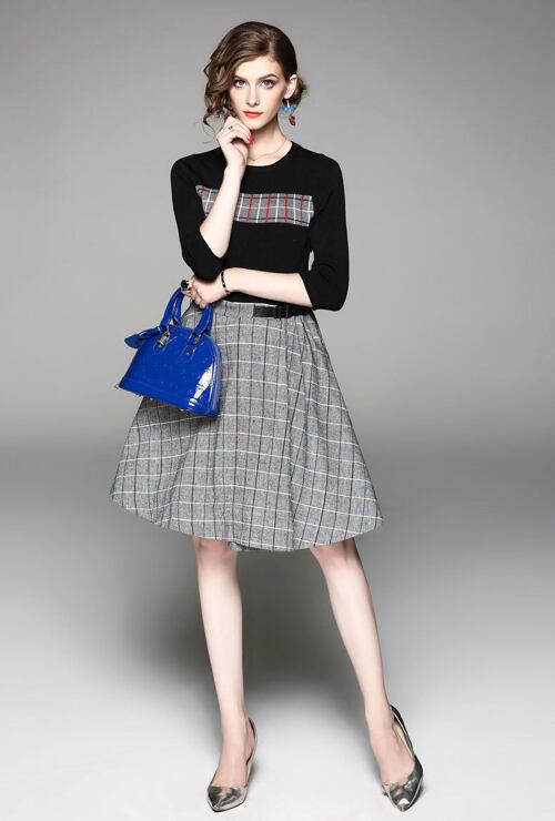 「大特価」 新作 上品 7分袖 ニット チェック 切替 ワンピース