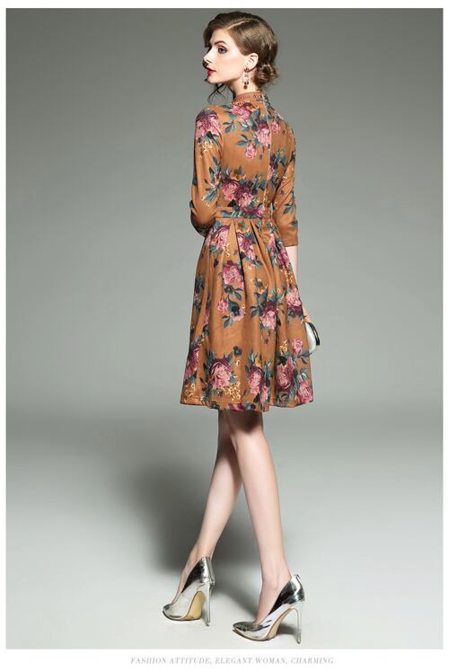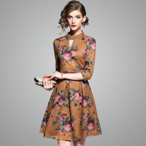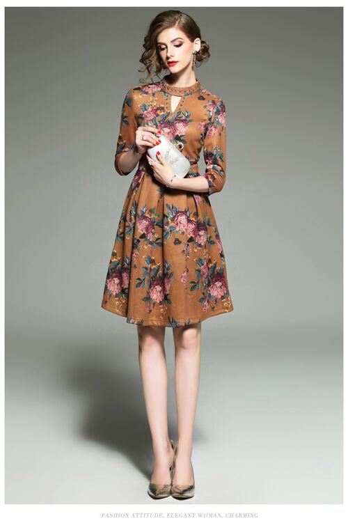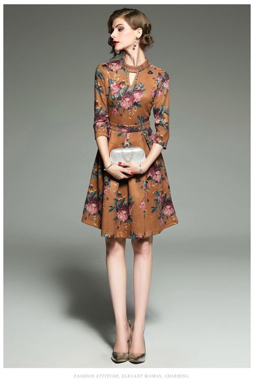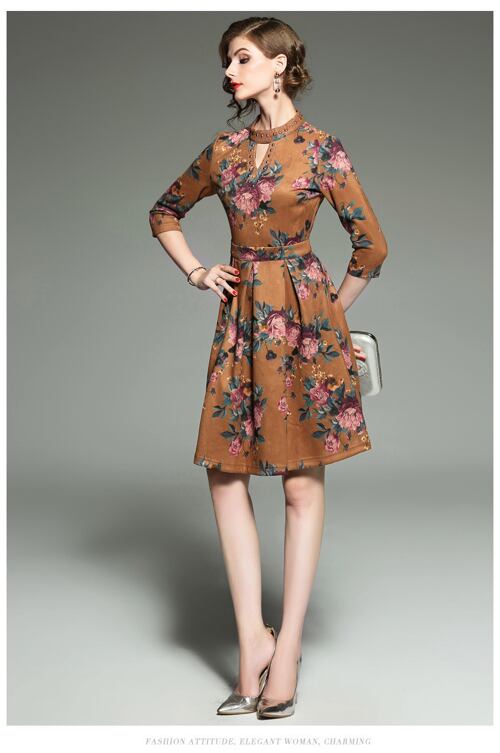 「大特価」 新作 上品 フラワー プリント スリム 7分袖 ワンピース