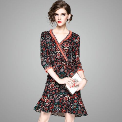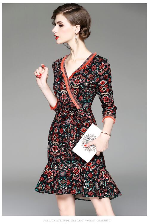 「大特価」 新作 キュート Vネック プリント フレア ワンピース