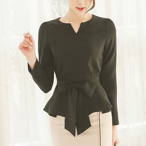 【2色】フェミニン★スリットネックリボンフレアブラウスdod126