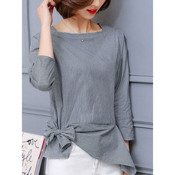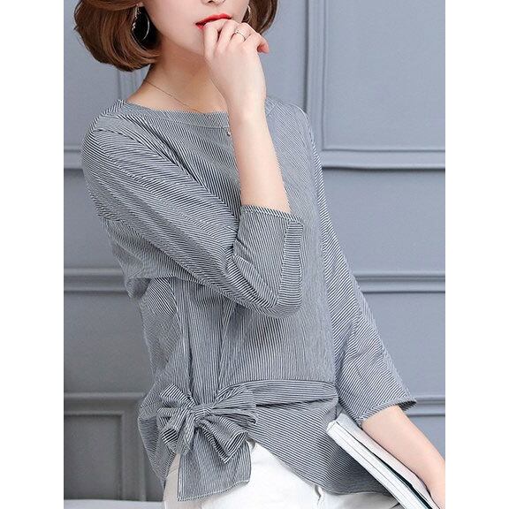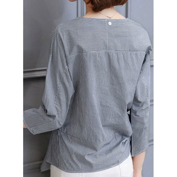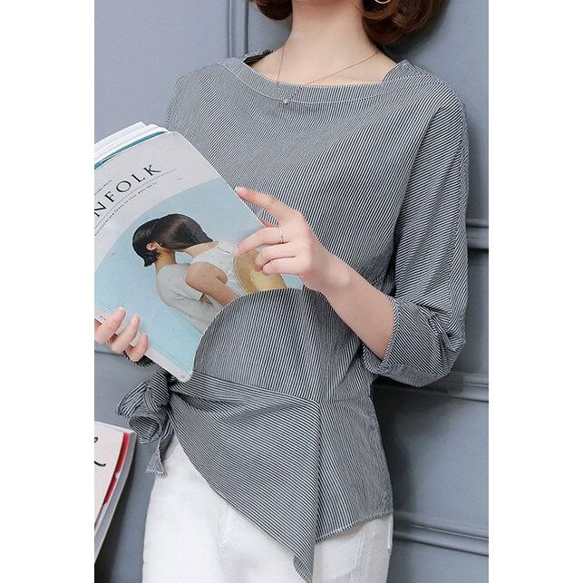 ★ワンサイドリボン♪細ストライプ柄イレギュラーヘムトップス★