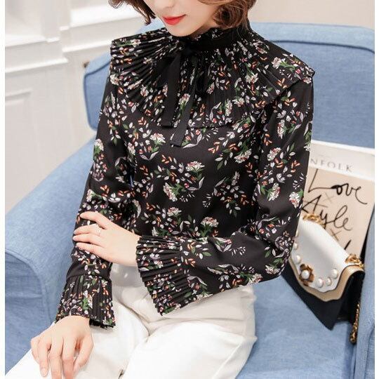 ★細プリーツハイネック♪小花柄クラシカル風トップス全4色★