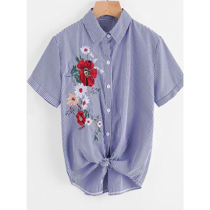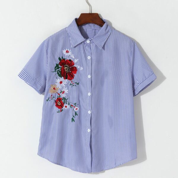 ★華やかフラワーブーケ刺繍♪ブルーストライプ柄トップス★