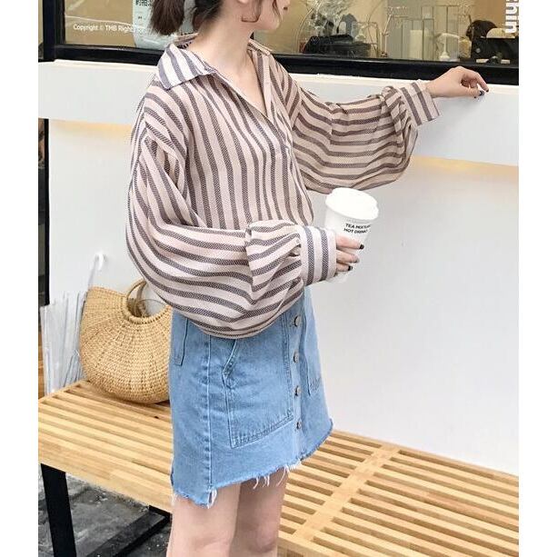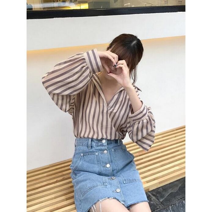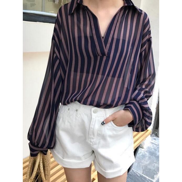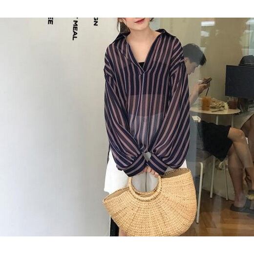 ★ほんのり透けデザイン♪開襟ストライプ柄トップス全2色★