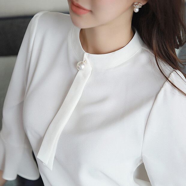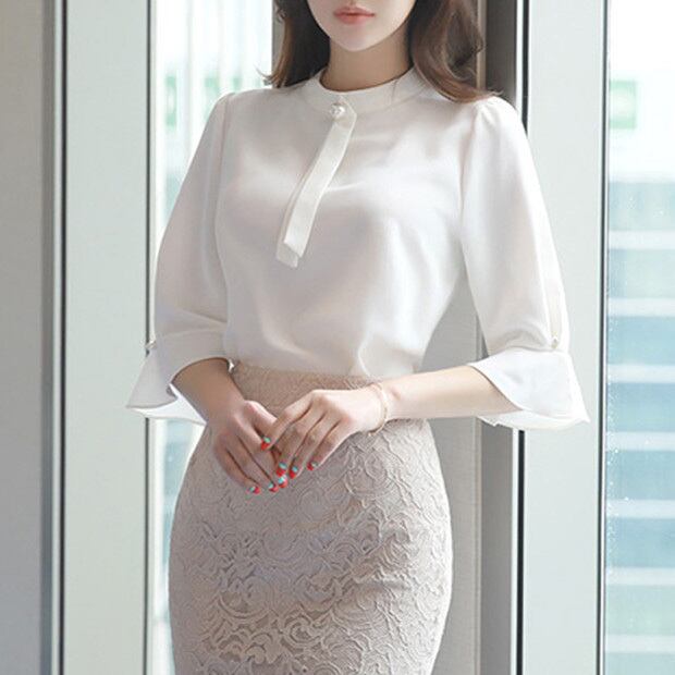 ★ボウタイパールアクセント♪七分ベルスリーブ白ブラウス★