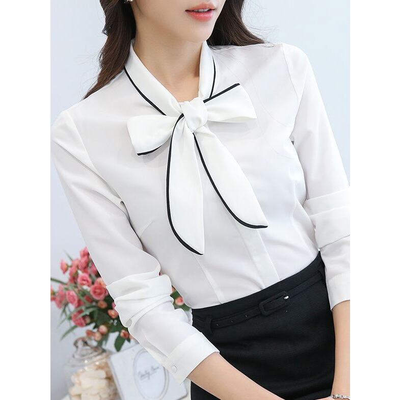 ★アクセントライン入りボウタイ♪ホワイトシフォントップス★