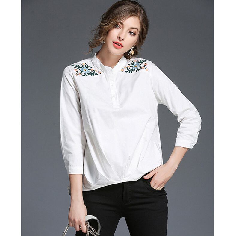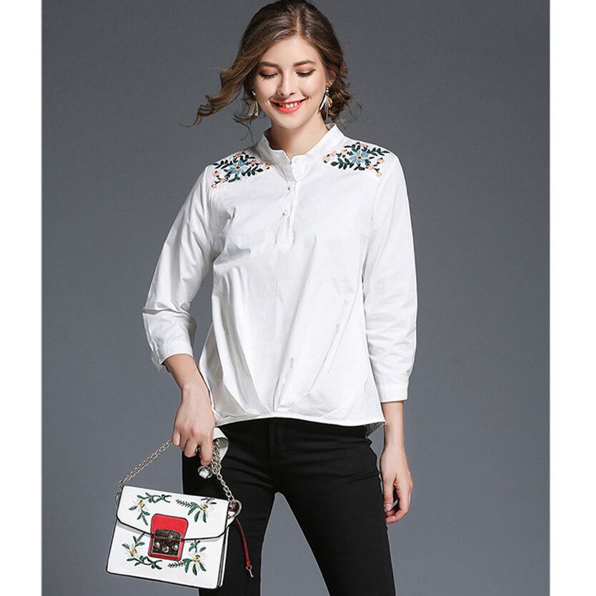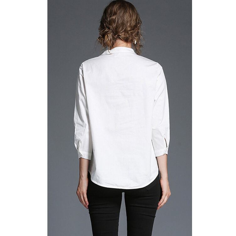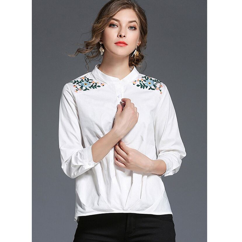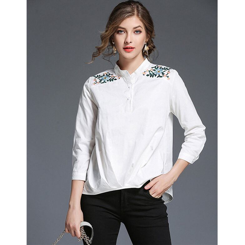 ★フラワー刺繍ショルダー♪バンドカラー長袖ホワイトトップス★