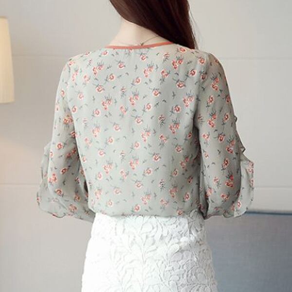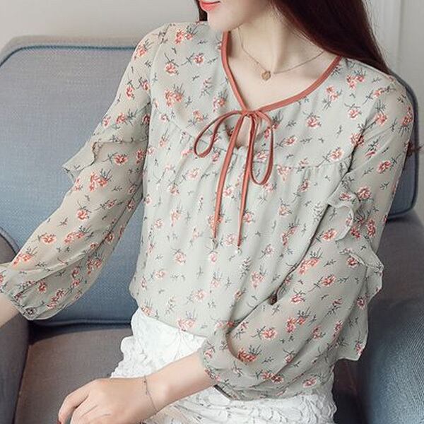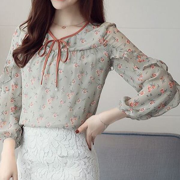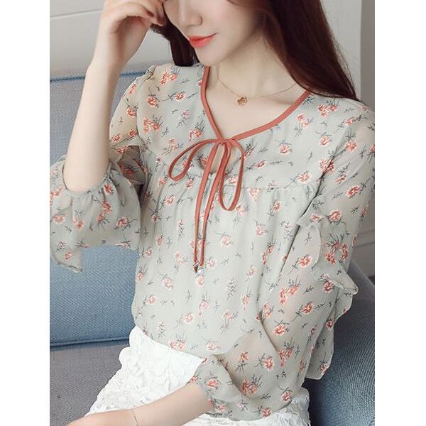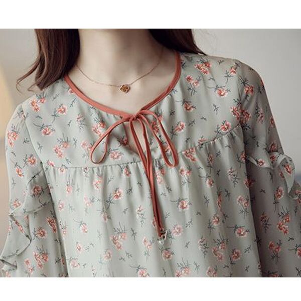 ★フリルトリムスリーブ♪胸元リボン小花柄シフォントップス★