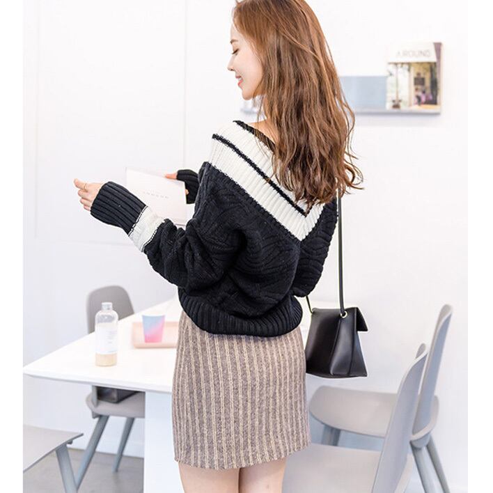 ★ビッグVライン♪模様編みバイカラーニットセーター全2色★