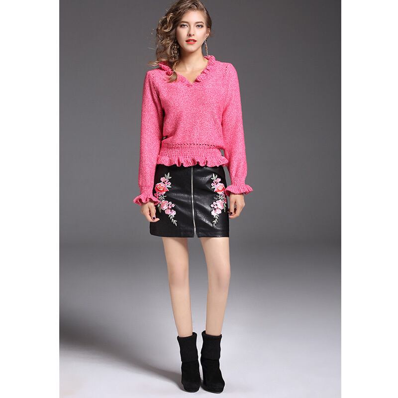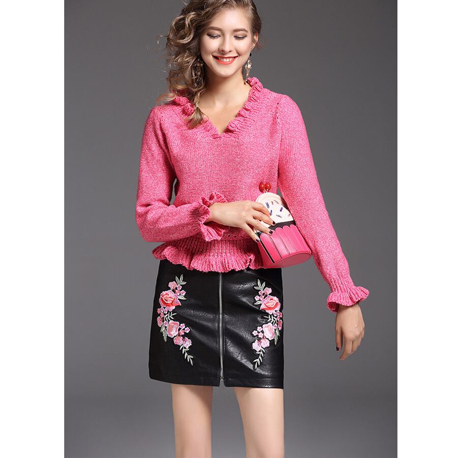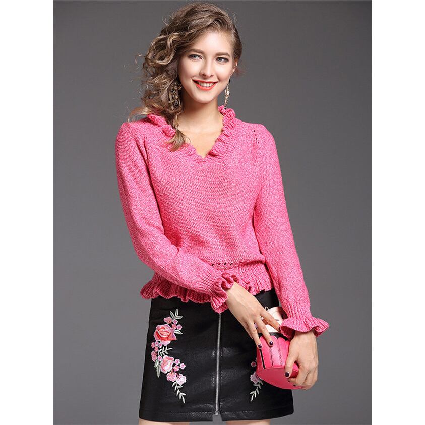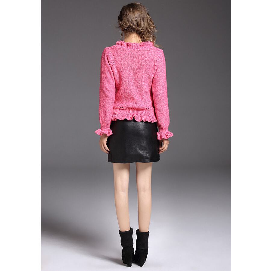 ★フェミニンウェーブフリル♪ローズ色Vネックニットセーター★